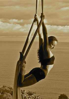 Her classes started out with stretching and yoga, and included some pilates exercises to warm up the shoulders. Â Utilizing stretchy, rubbery fabric strips that Ana brought with her, we did repetitive small rotations and flexes, which at first seemed ridiculously easy, but after doing twenty of them in multiple directions, were very effective at warming up the insides of the joints, tendons, and ligaments. Â Of course this was to help prevent should injuries when practicing various moves and tricks on the silk.